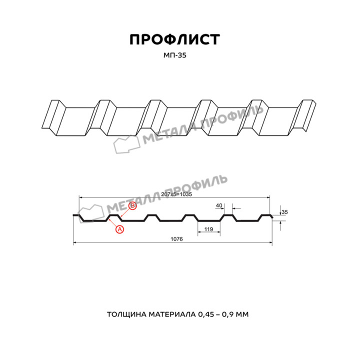 Профлист Металл-Профиль МП-35 Полиэстер 0.45 мм RAL 9006 Белый алюминий